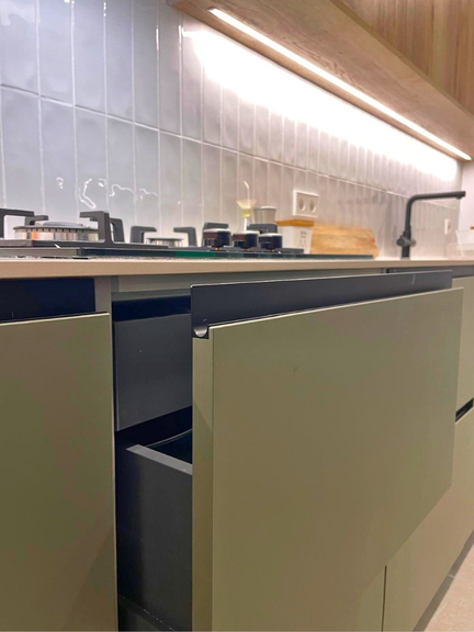 Y asi, combiando detalles en madera de roble en los muebles altos y perfiles negros sin tiradores que aportan ritmo y modernidad.
