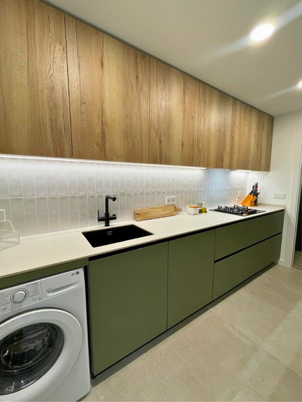 Cocina verde en Molins de Rei: una cocina con color en un espacio alargado