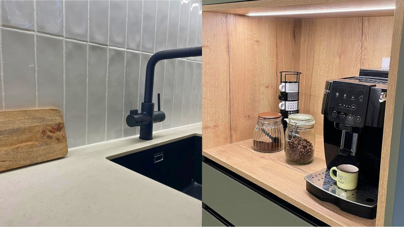 Un elemento clave fue la hornacina abierta en madera, un rincón de desayuno y cafetera que rompe la uniformidad de los armarios.