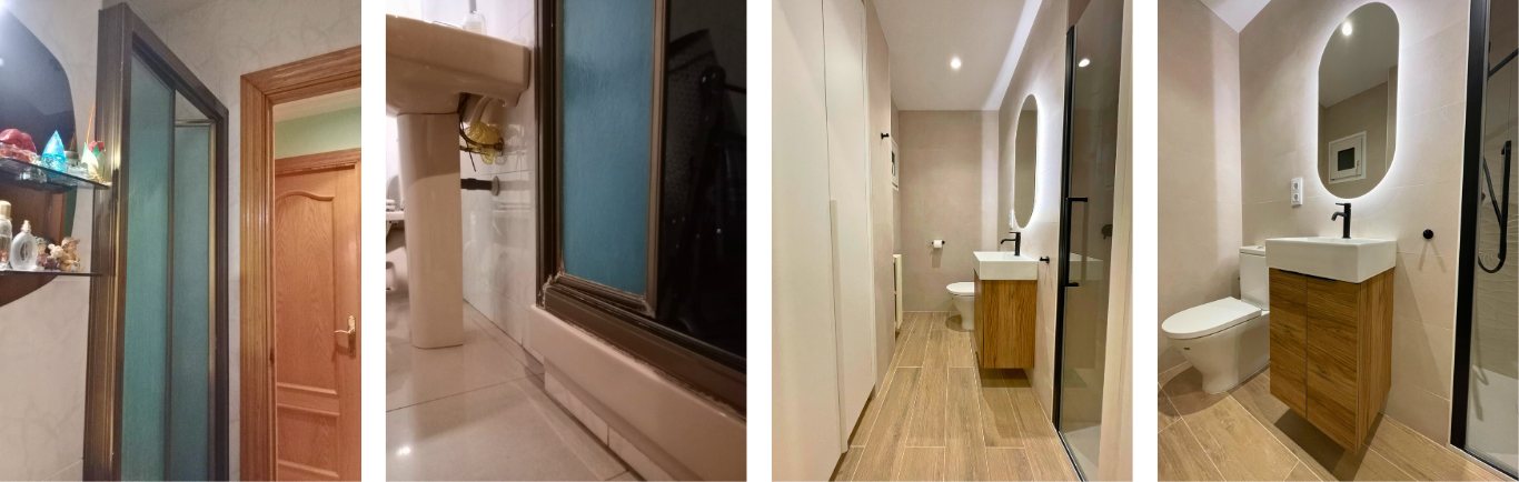 Antes de la reforma, ambos baños presentaban limitaciones habituales: revestimientos anticuados, poca luz natural, almacenaje escaso y una distribución poco eficiente.