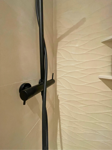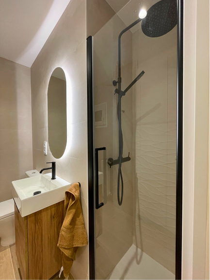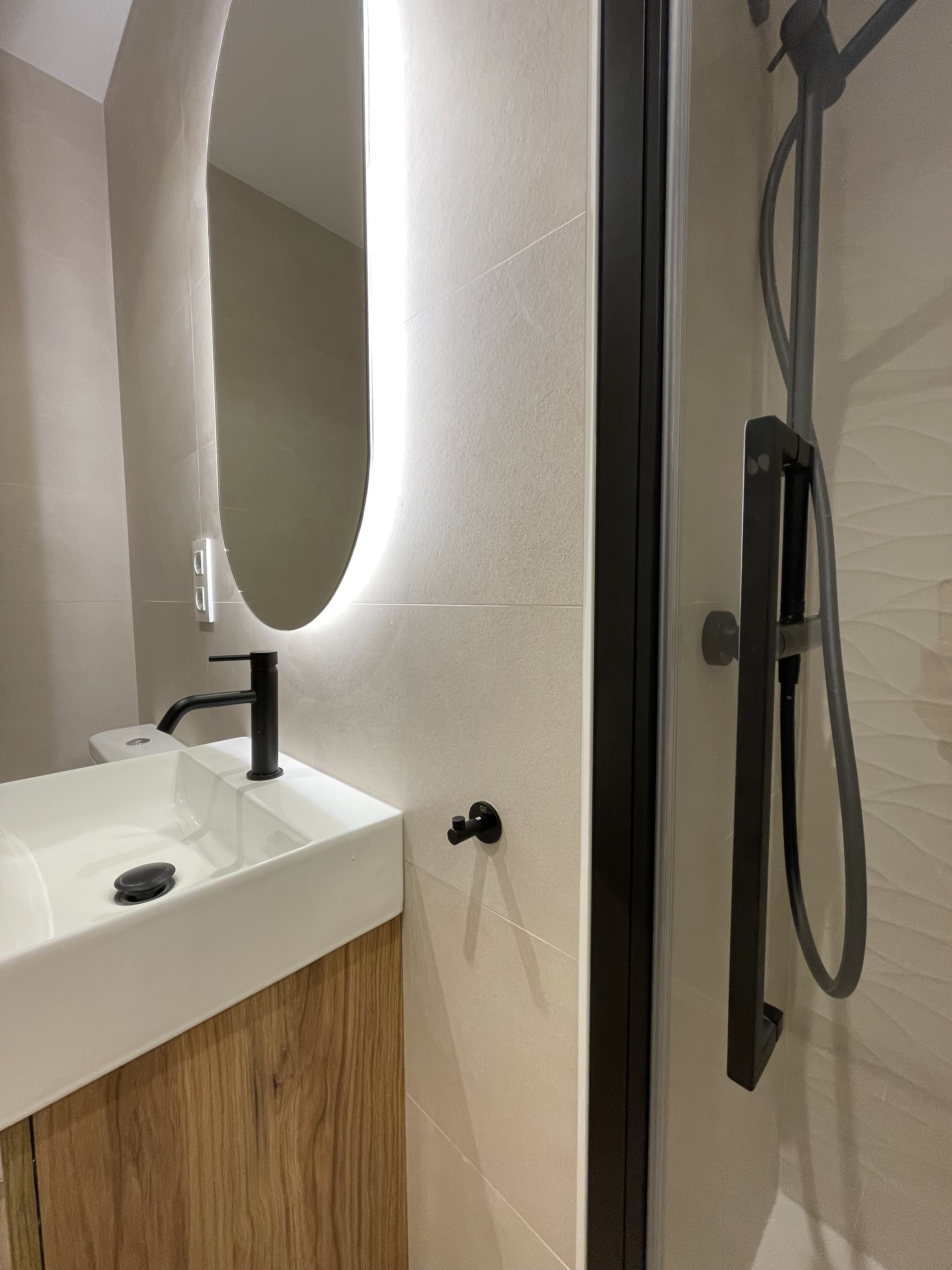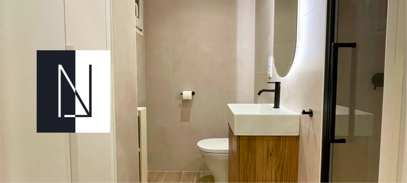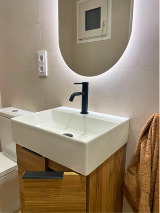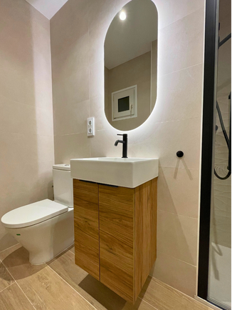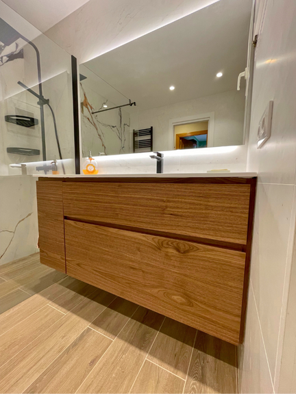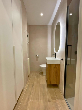 En el baño pequeño, cada centímetro se ha pensado para sumar: mueble a medida suspendido en acabado madera, armario empotrado y distribución funcional que mejora el uso diario.