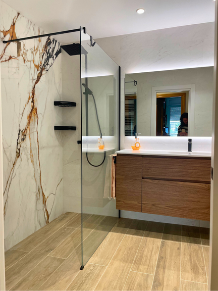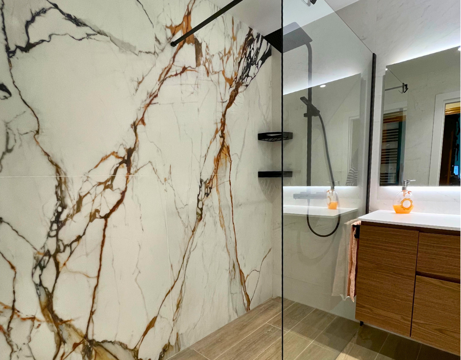En el baño principal, optamos por piezas de gran formato efecto mármol de XLight (Porcelanosa) y una ducha de obra con suelo continuo antideslizante en acabado madera.