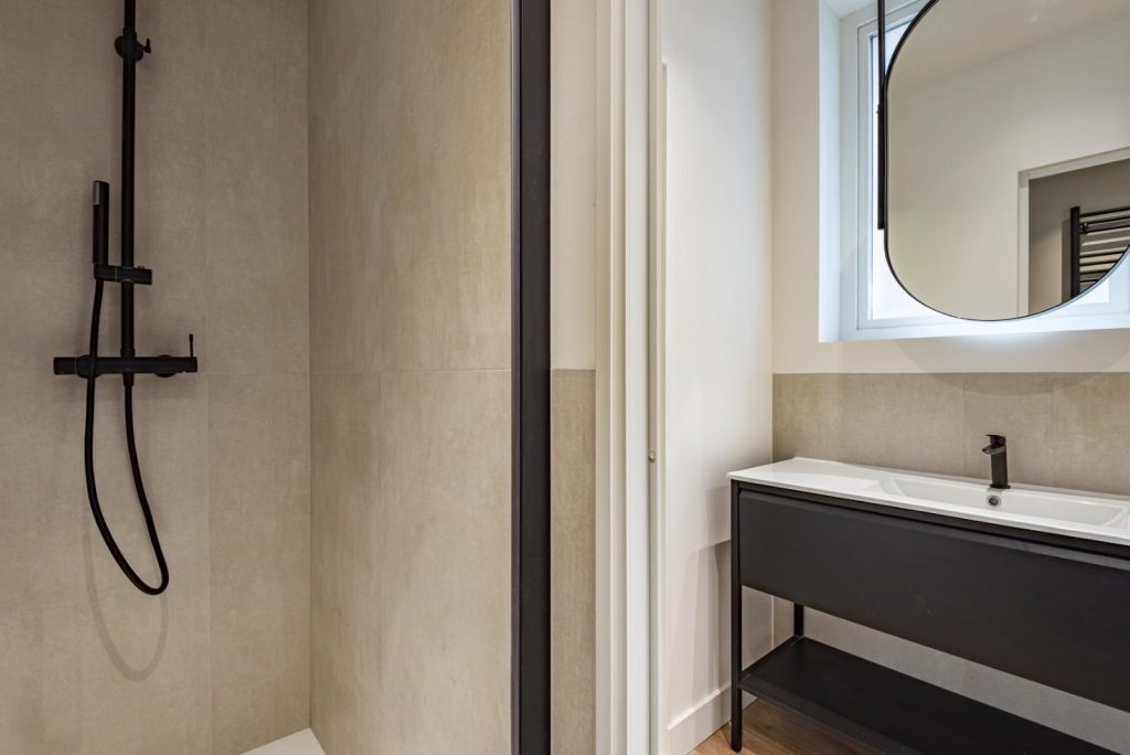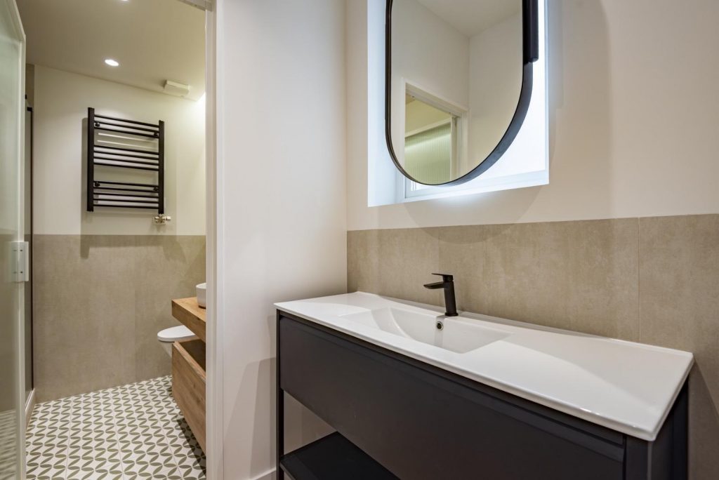 Cada baño mantiene coherencia con el estilo general del piso sin imitar el pasado, demostrando que la modernidad puede convivir con elementos históricos.