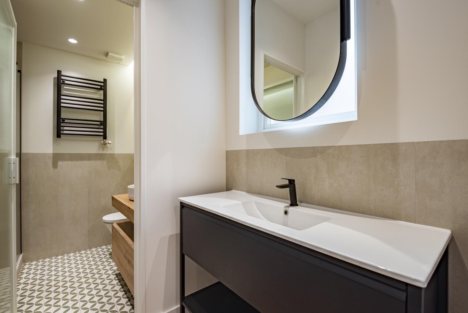 El baño secundario apuesta por la calidez, con suelos hidráulicos verdes y muebles de roble suspendidos que dialogan con un lavabo tipo bol.
