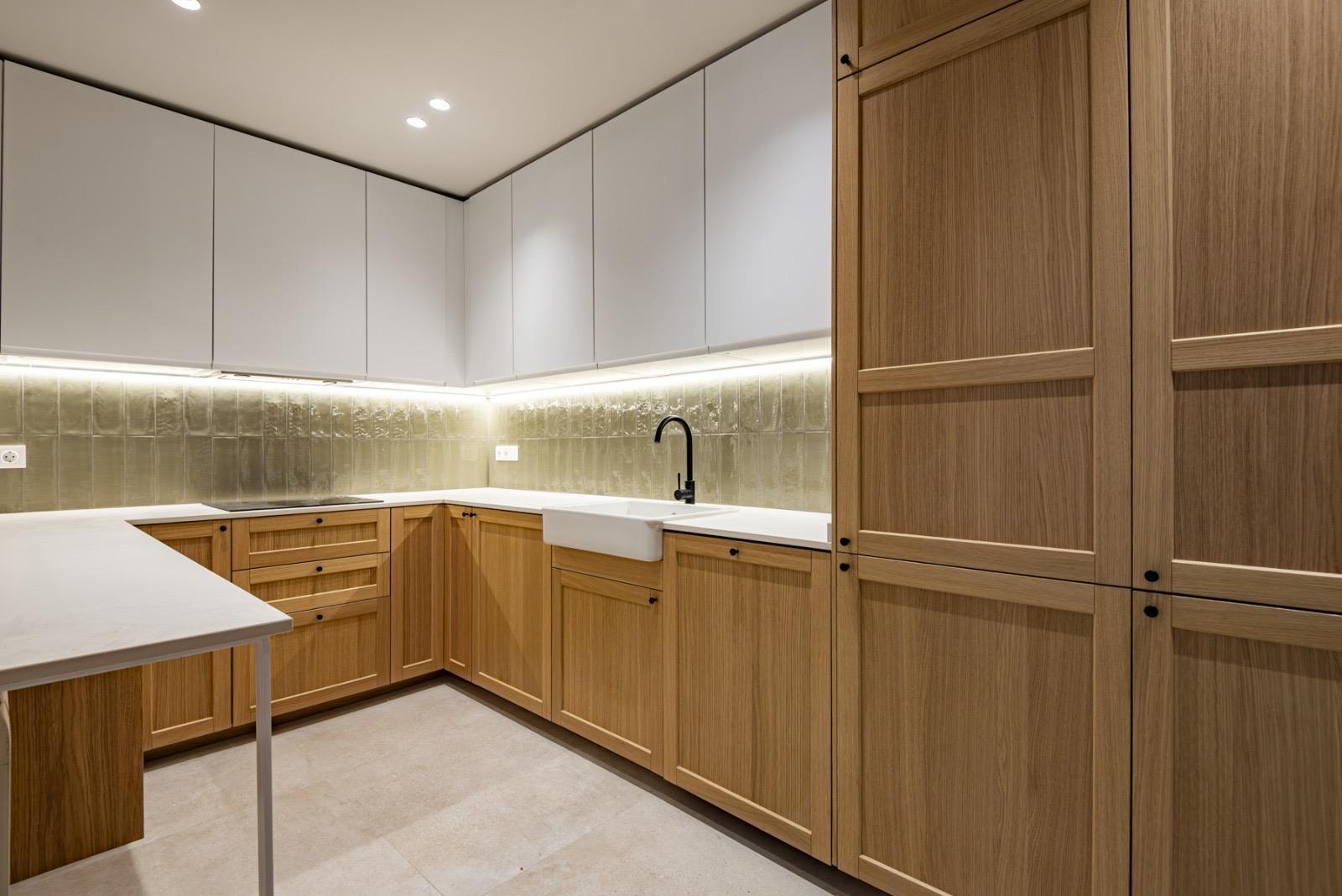 La elección de materiales fue clave: madera de roble natural, frentes blancos lisos, un fregadero de gran tamaño y azulejos artesanales en verde aportan calidez y carácter.